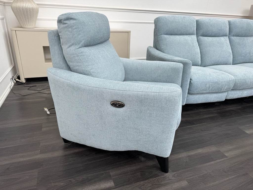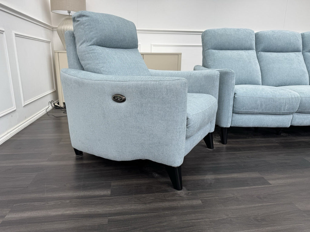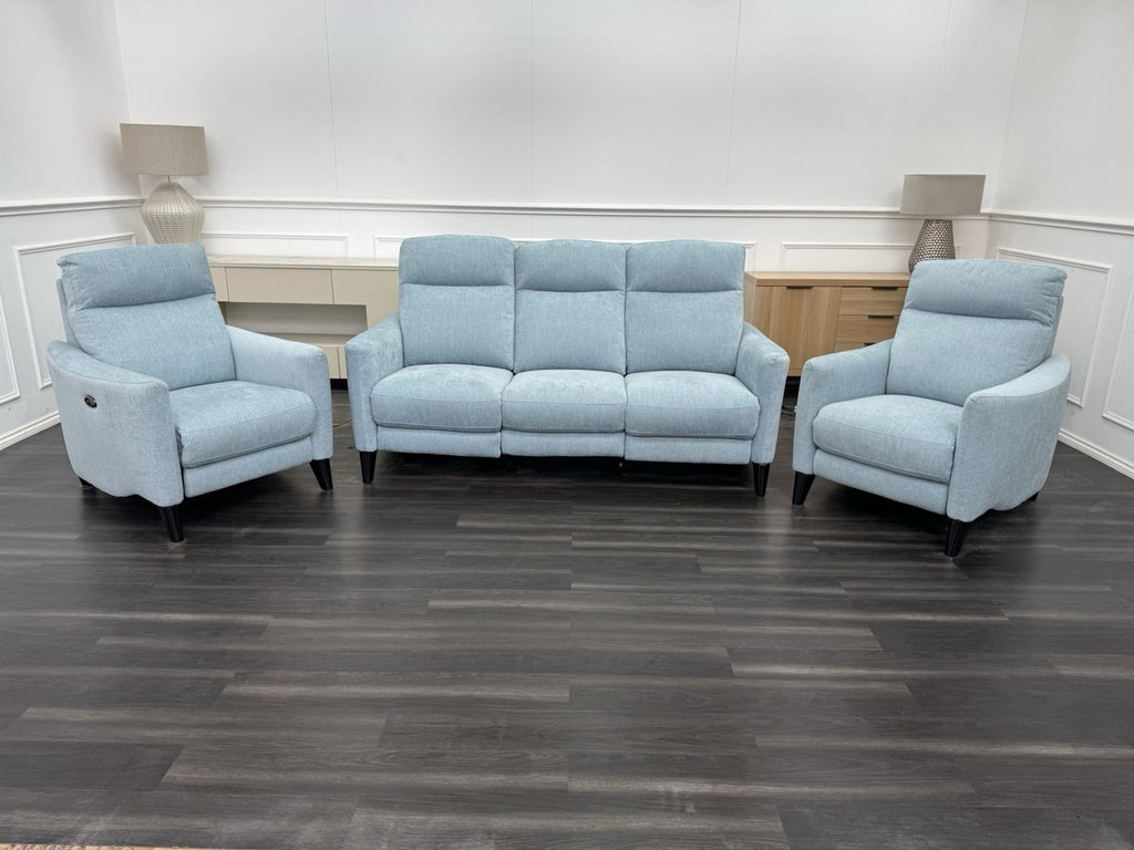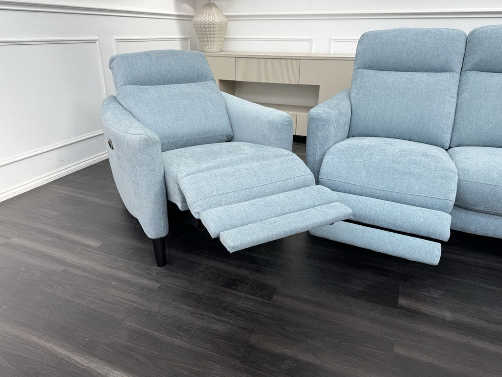 Furniture Village Petit Sky Blue Fabric Power Recliner 3+1+1 Seater Sofa Set