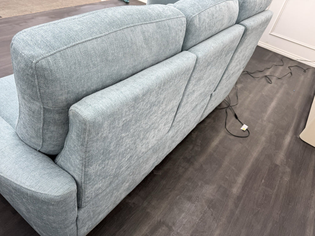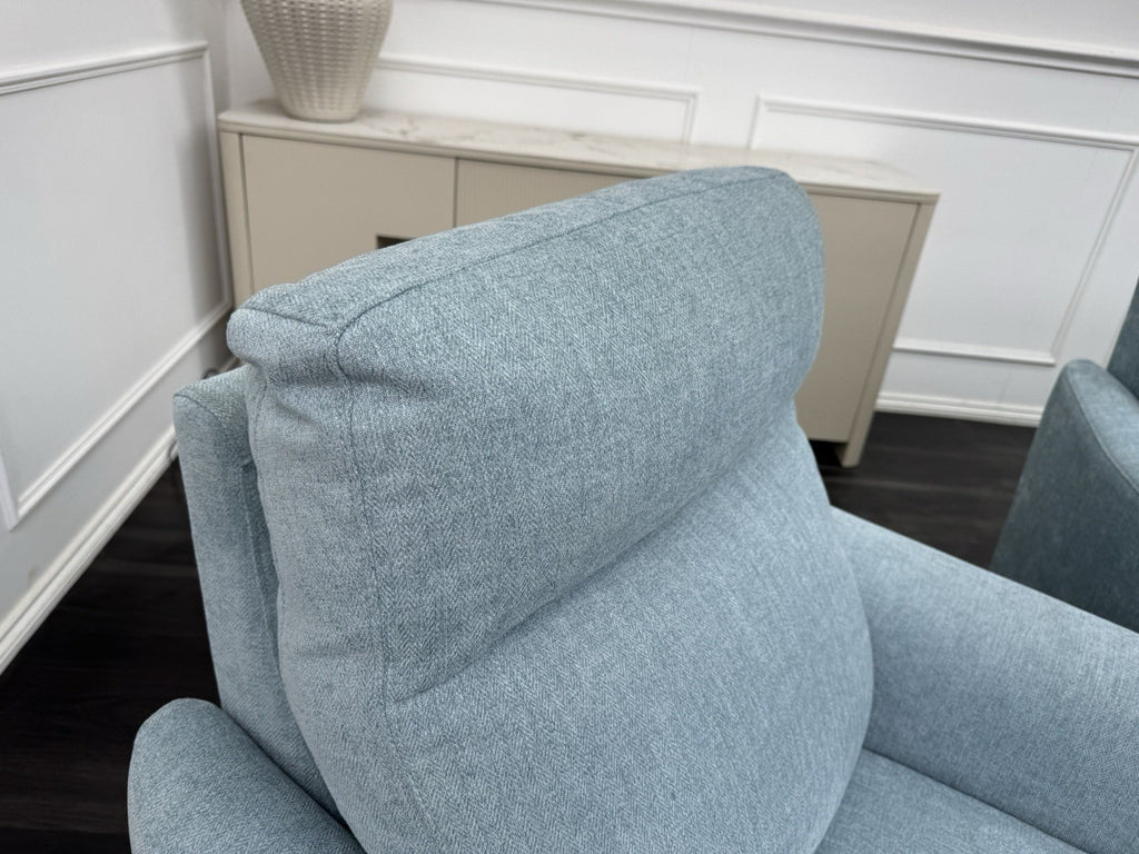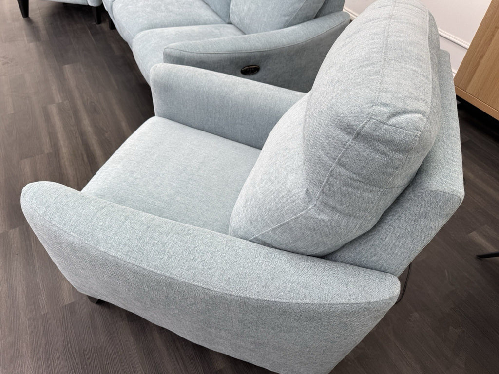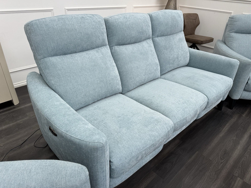Furniture Village Petit Sky Blue Fabric Power Recliner 3+1+1 Seater Sofa Set